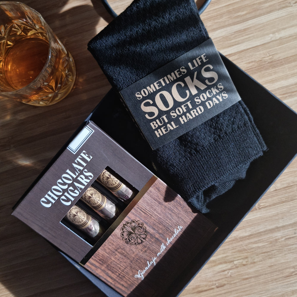 This gift set is a wink to classic gentleman culture, without the smoke. A vintage-style box with three luxury Gianduja milk chocolate cigars and 2 pairs of black bamboo socks.